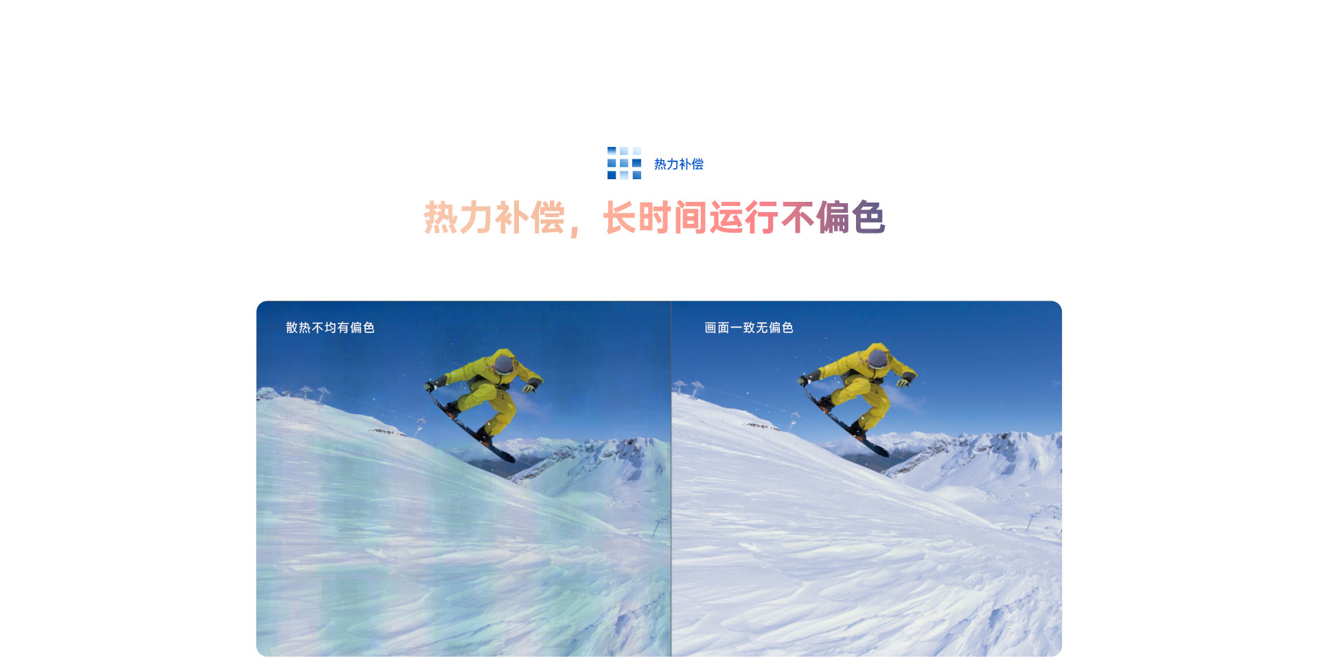 通过热力补偿技术,对屏体的热力特性进行校准,有效解决屏体热量分布不均所导致的偏色问题。